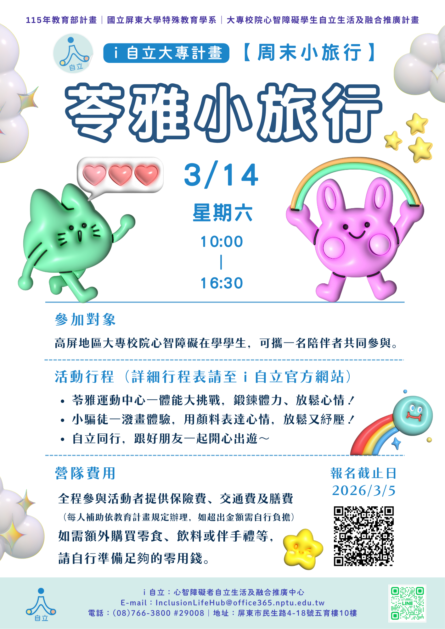 | 15:30 | 回家 | 苓雅運動中心 或 高雄火車站 | 確認學員是否有家長接送,或自行返家。 |